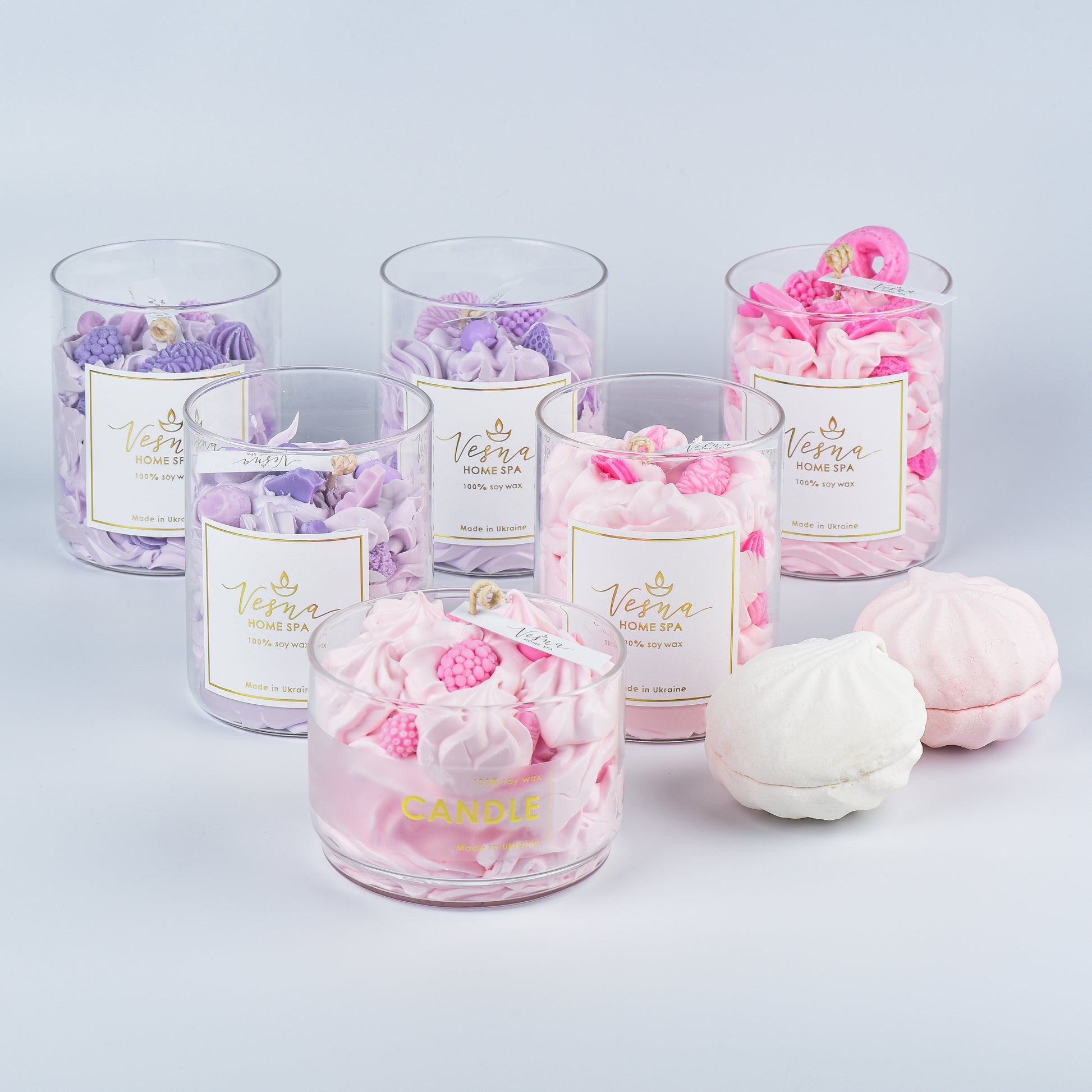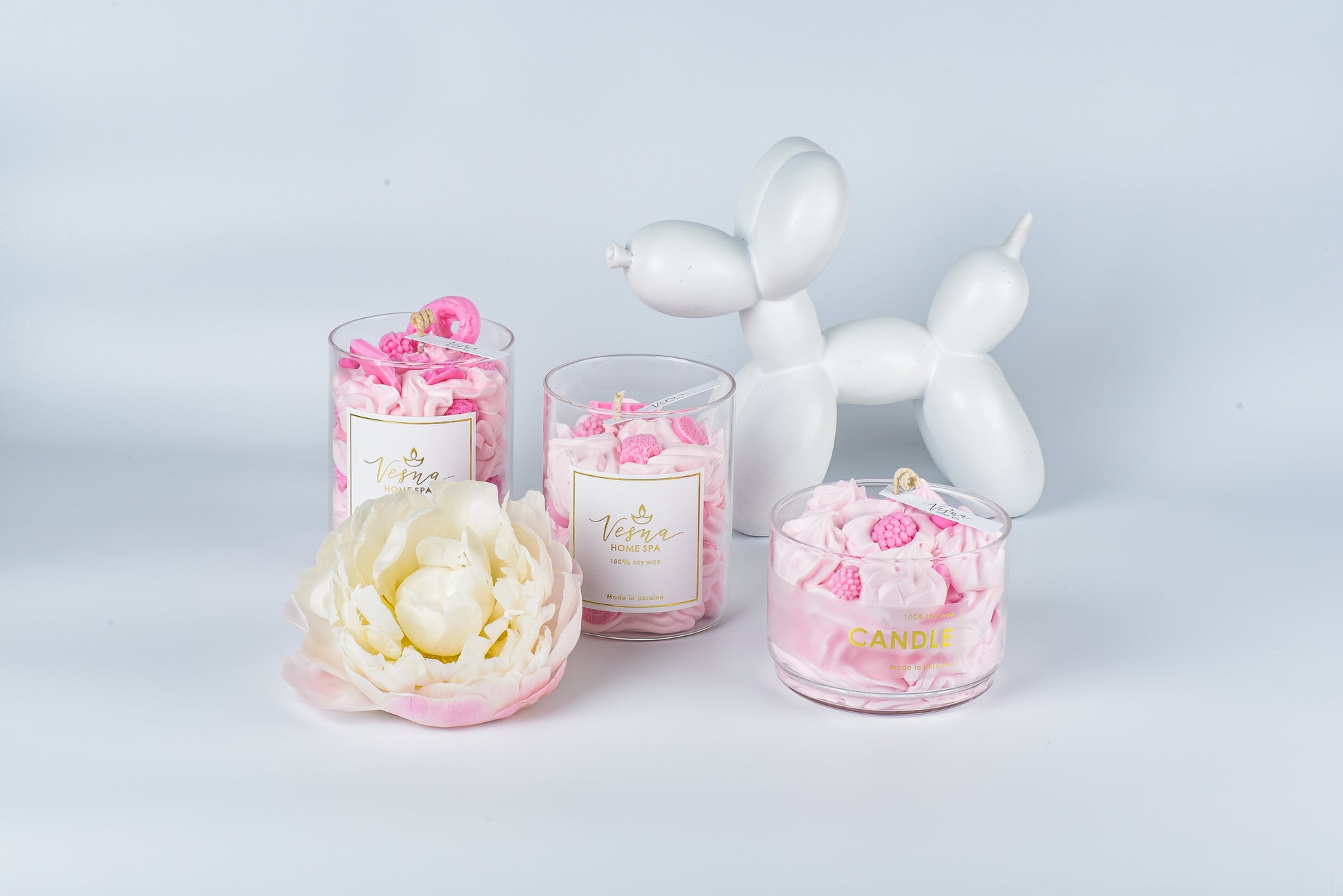 - Рожевий “Ягідний коктейль” — ніжний аромат свіжих ягід з вершковими нотками, який огортає теплом і дарує відчуття свята.